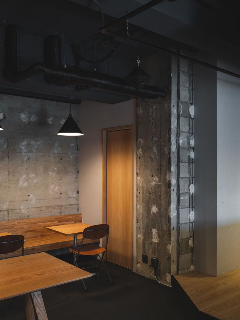 奥のベンチソファーに座り店内を見回すと、あらわしにしている躯体のコンクリート壁が目に入る。時間を経たコンクリート壁は、墨出しやボンド跡があり、この建物ならではの表情をもつ。天井や床、造作家具はその雰囲気を崩さないよう、質感がある素材を仕上げとし、色の種類を極力少なくしている。