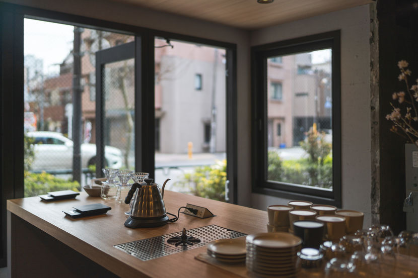 ドアを開けると、視線の先には厨房カウンターと真鍮の文字がお客様を迎える。ご主人がコーヒーをいれる姿が通りを行く人から見え、興味を持ってもらえるよう、厨房を入口近くに配置している。